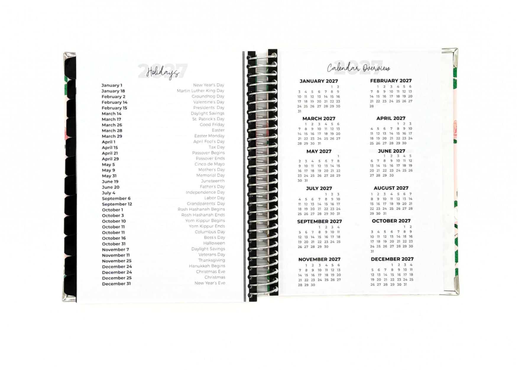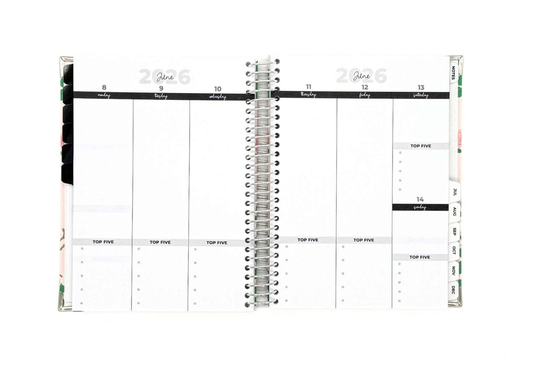 Your new planner is also as durable as it is sleek and attractive. Enjoy a silver spiral binding so your planner can lay flat, reinforced corners that won't bend or break, and an extra durable cover with a gorgeous finish.