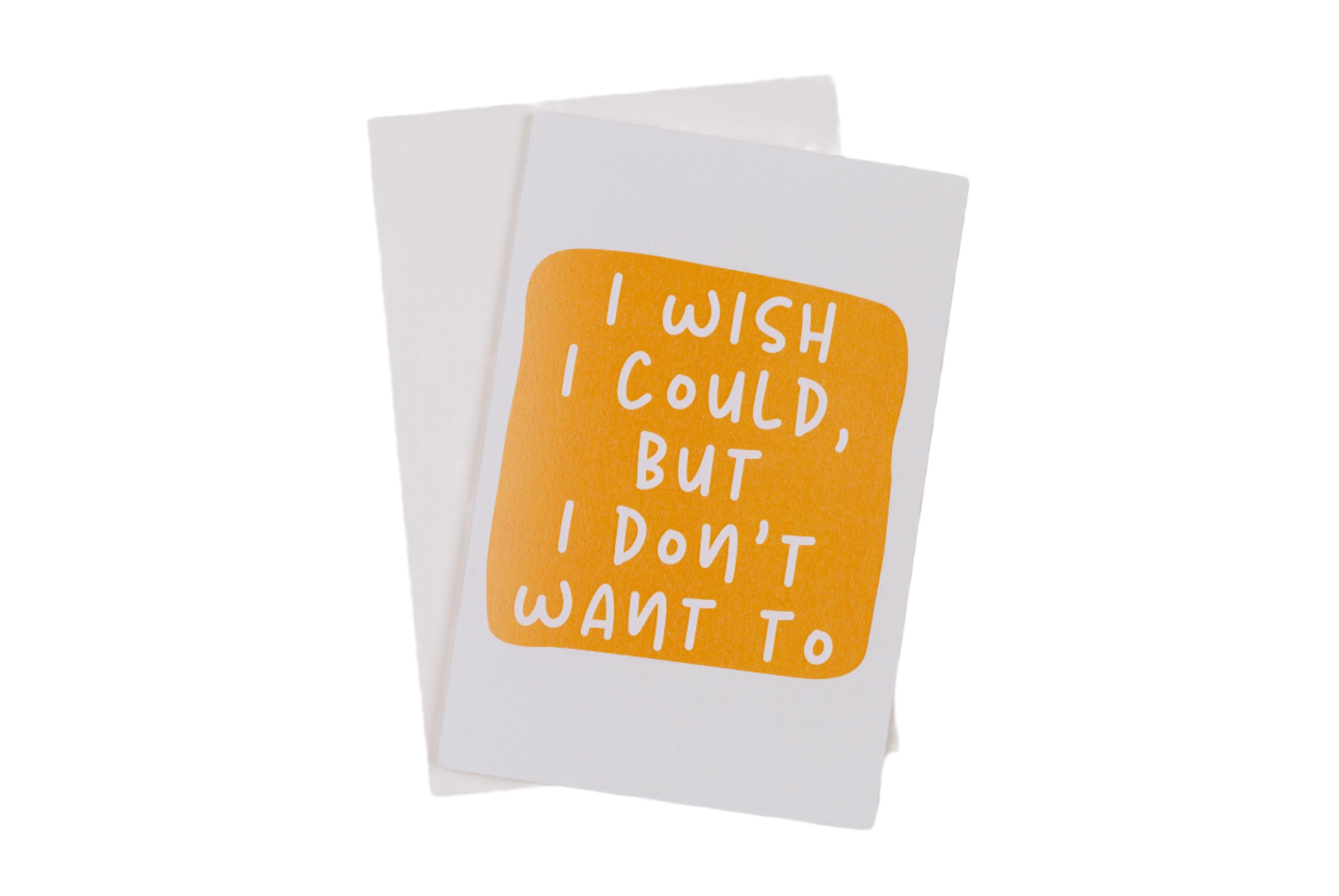 This 4x6 greeting card, made in the USA, lets you say what we're all thinking. Don't hold back - express yourself with the coordinating envelope included. "I Wish I Could, But I Don't Want To" encapsulates the inner conflict we all face (but with a hint of sarcasm).