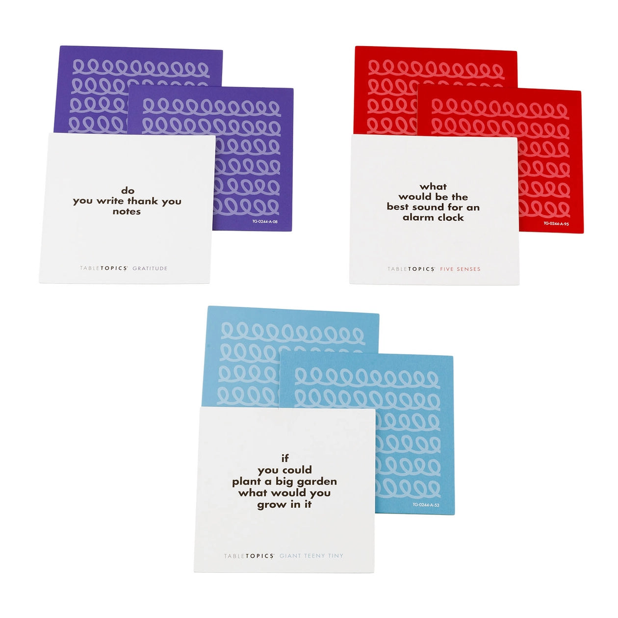 You get three editions in one pack. GRATITUDE: Here’s an opportunity to get your kids to talk about the people, places, and simple things they are most grateful for. GIANT TEENY TINY: This set of questions helps you see the world from your child’s point of view. What’s really big or super small? Talk about it all. FIVE SENSES: These fun questions get kids to reveal how they perceive the world around them. Loud, soft, cold, crunchy, bright, salty, sweet, and everything in between.