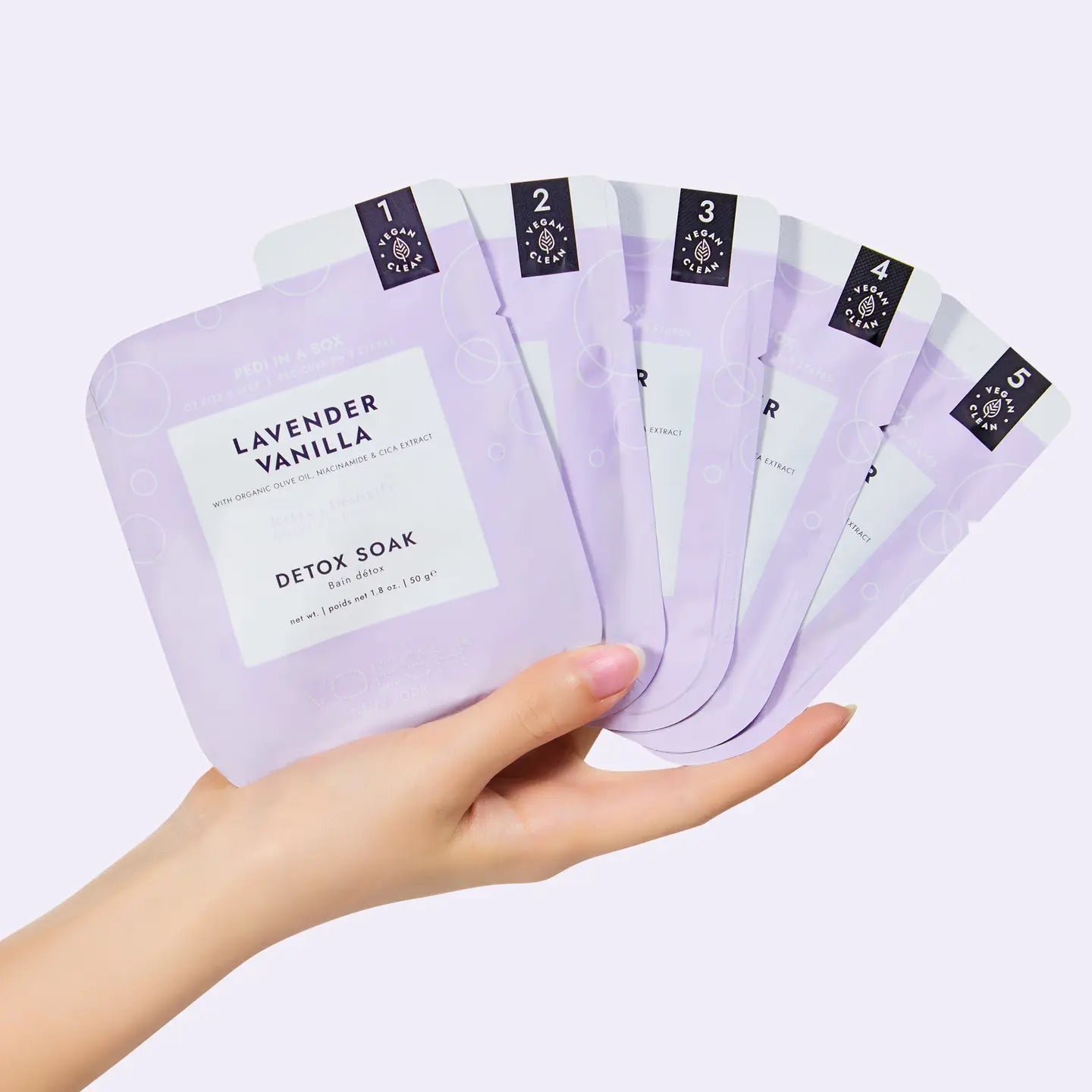 Step 1: Detox Soak Pour detox soak into a warm foot bath and mix well. Soak feet for 5-10 minutes to detoxify and deodorize.