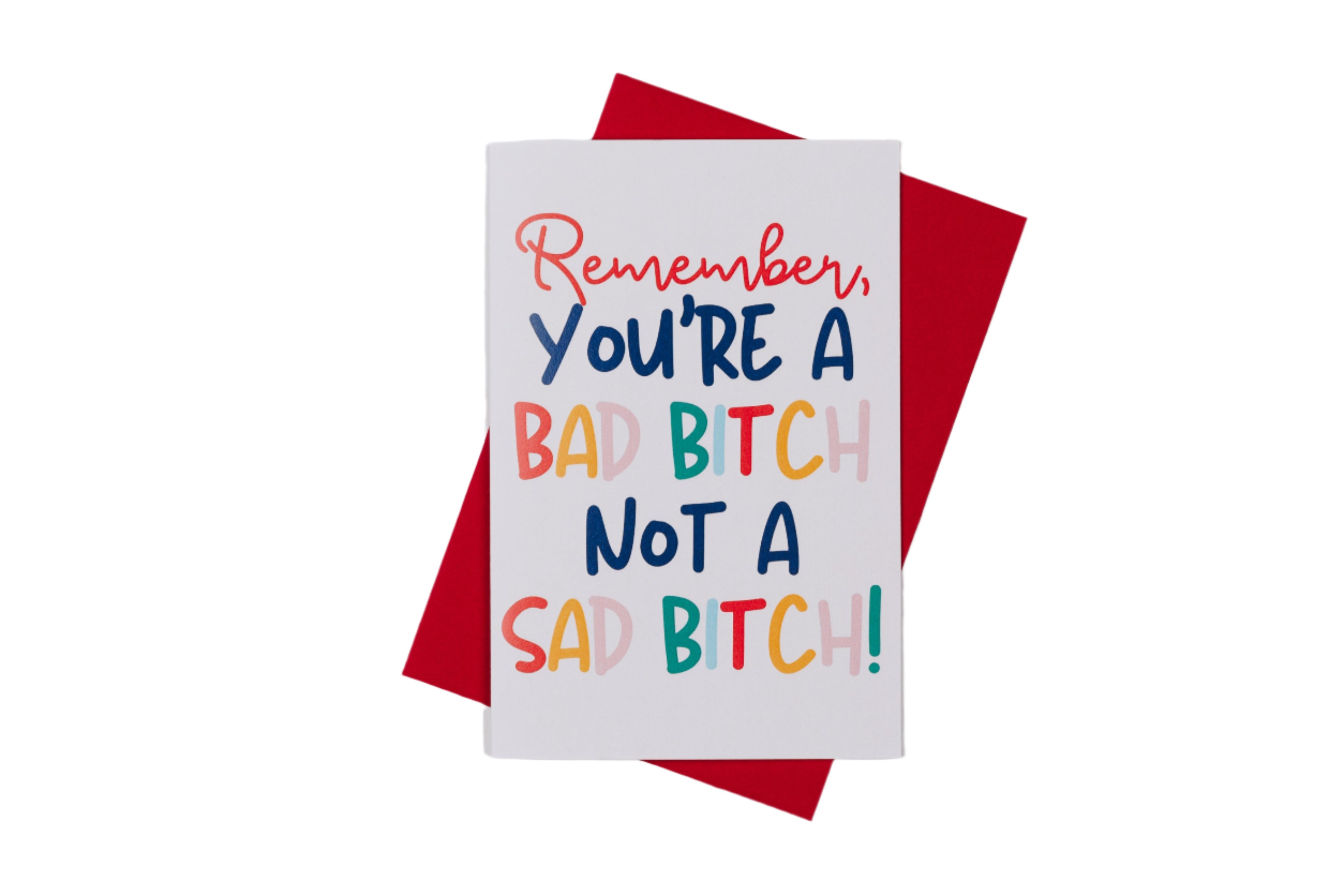 Remember who you are and cheer up with our You're A Bad Bitch, Not A Sad Bitch Card. Featuring a playful 4x6 design and coordinating envelope, this card is made in the USA. Perfect for sending some quirky and humorous love.