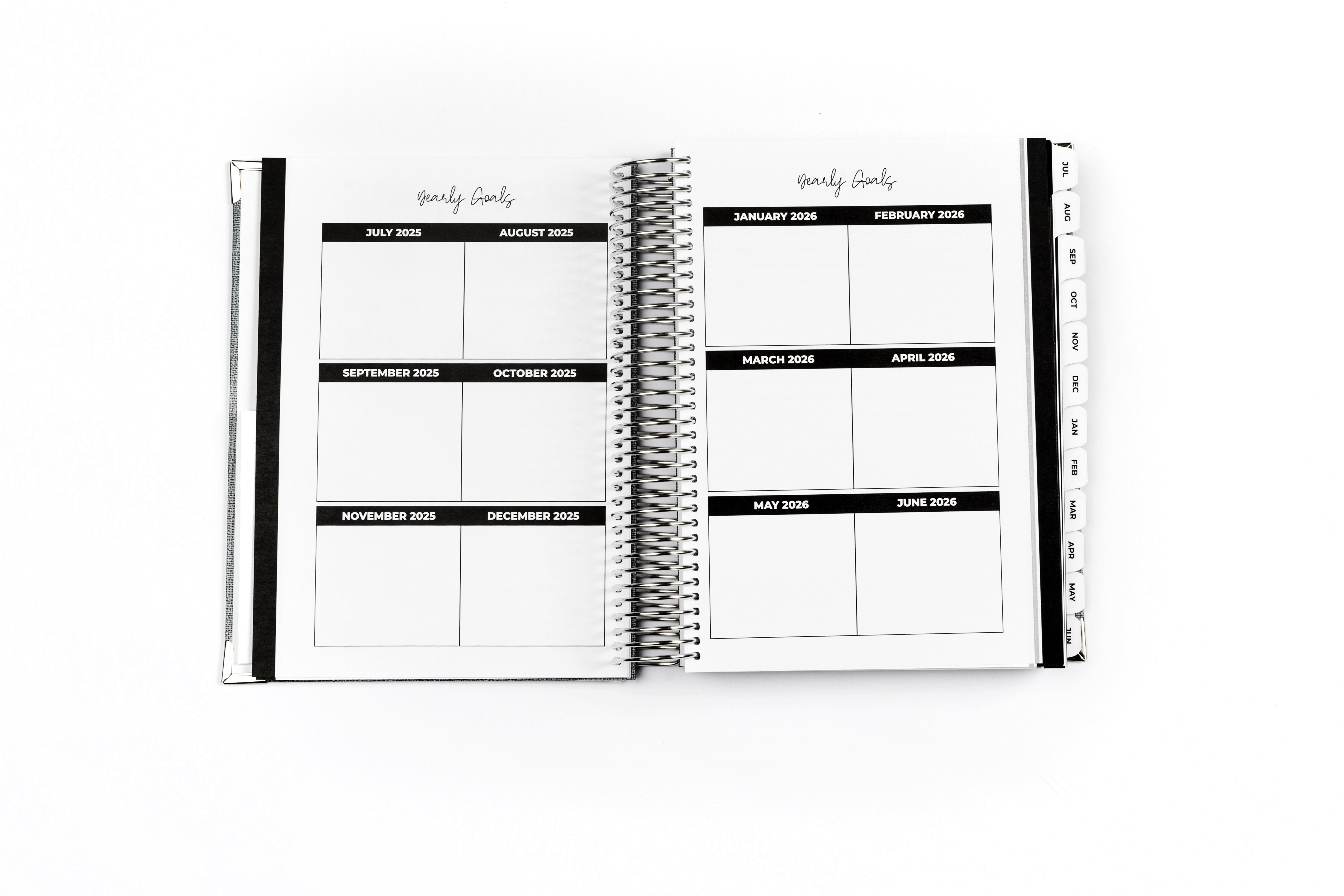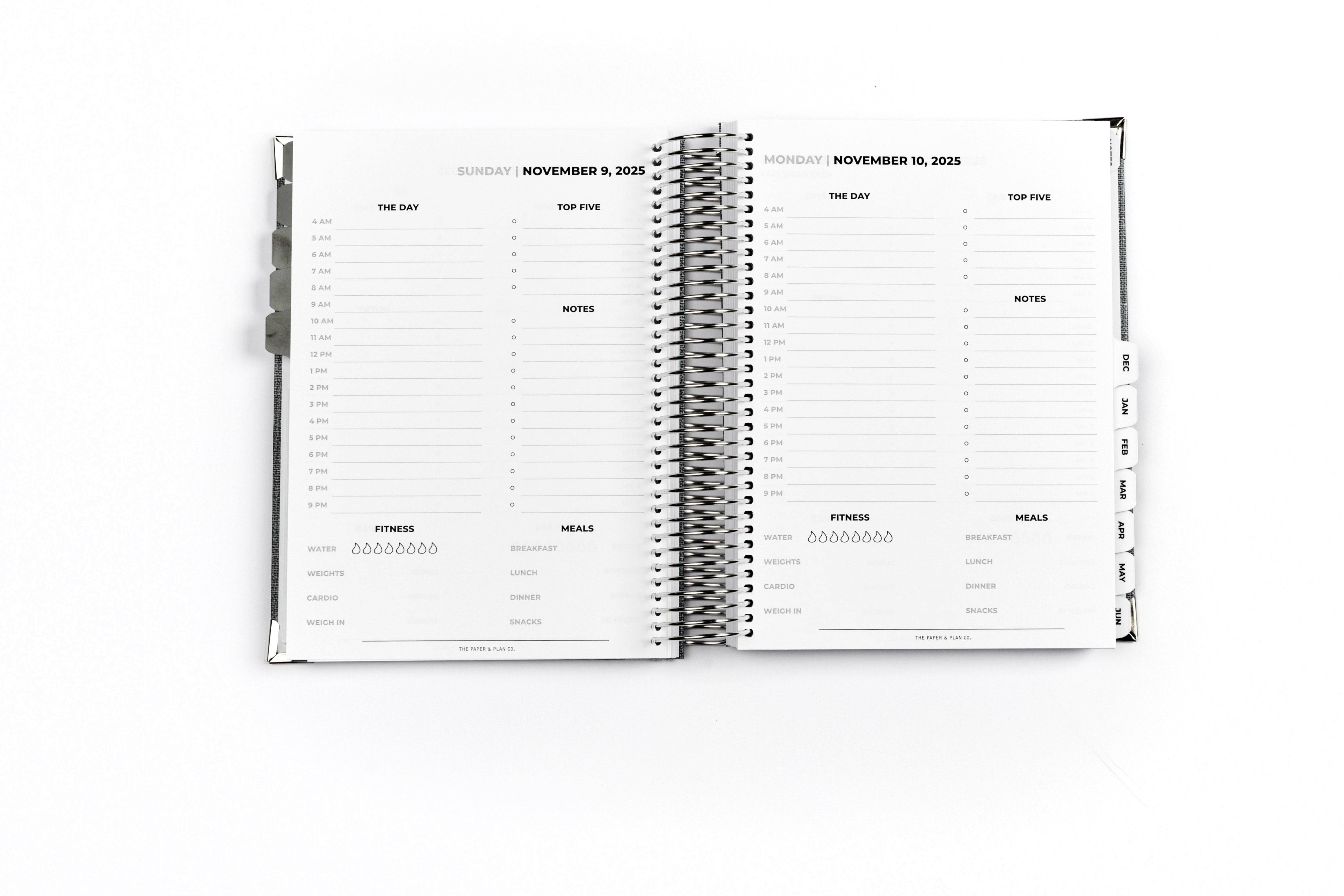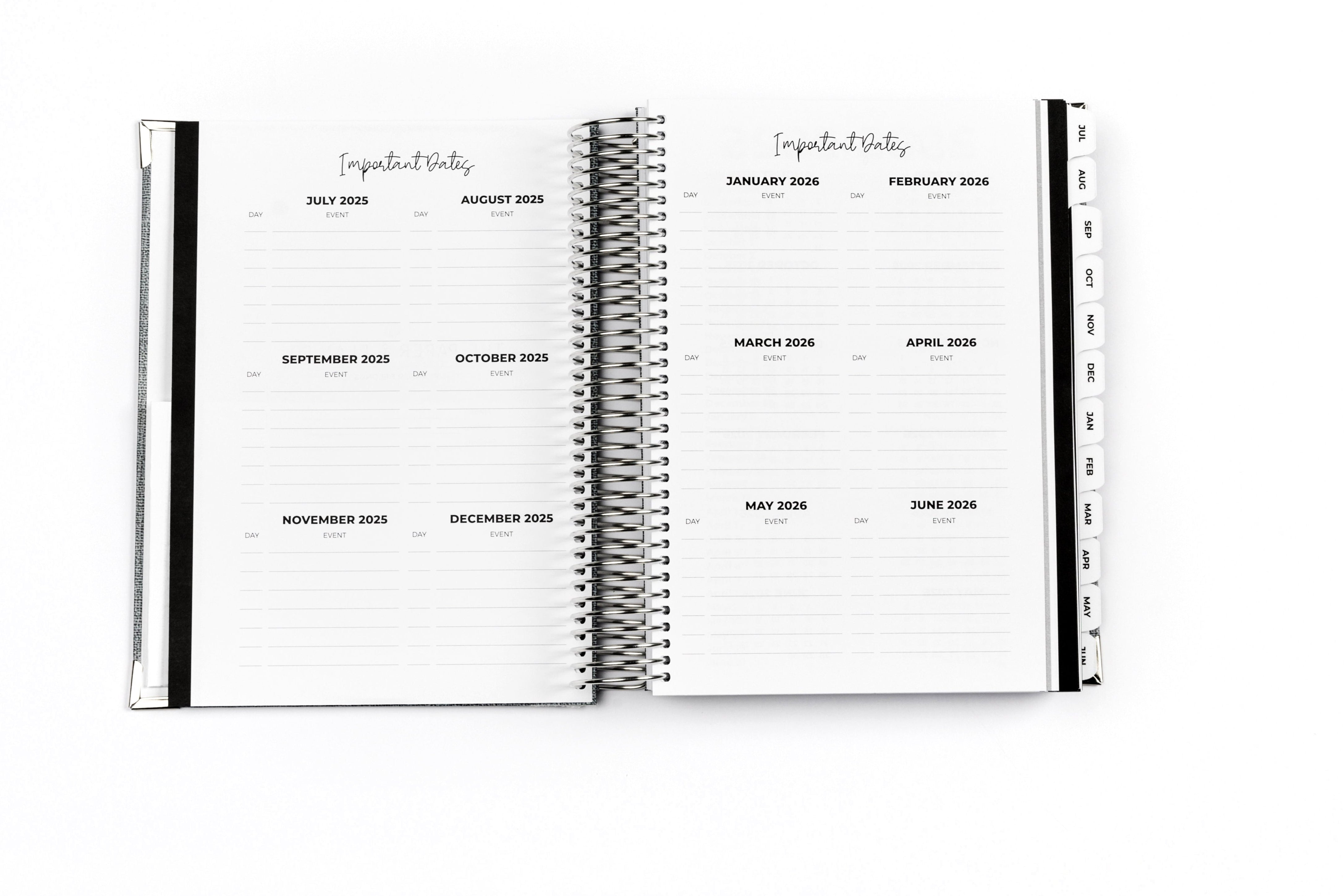 Your new planner is also as durable as it is sleek and attractive. Enjoy a silver spiral binding so your planner can lay flat, reinforced corners that won't bend or break, and an extra durable cover with a gorgeous finish.