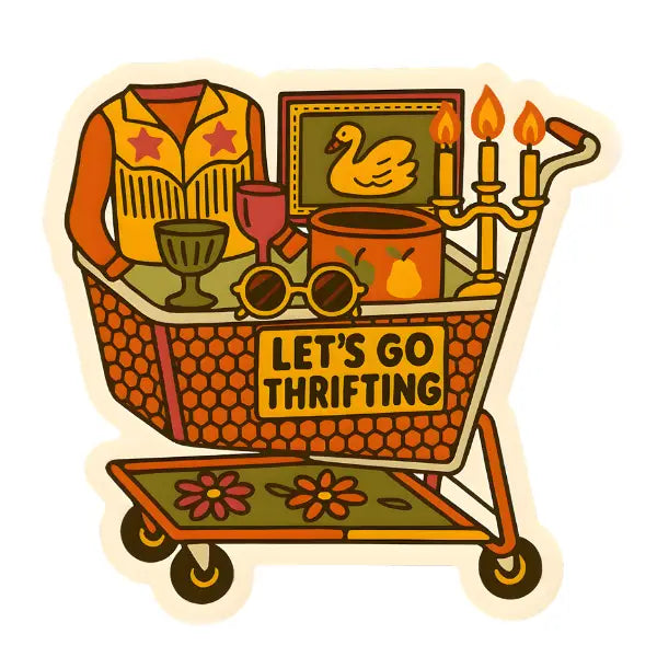 For the treasure hunters, estate sale regulars, and thrifting besties. This “Let’s Go Thrifting” sticker features a vintage-inspired shopping cart filled with cozy, retro finds—candles, glassware, funky fashion, and nostalgic décor. A perfect match for customers who love secondhand style, slow fashion, and the thrill of the hunt.
