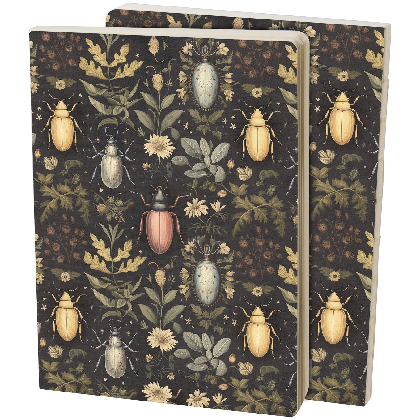 A double-sided journal from our Moody Collection displaying a pattern of various beetles and complementing florals in a deep color palette. Our Beetles journal includes 160 lined pages and an open spine to lay flat for easy use. A dark academia inspired gift perfect for an everyday accessory. *Pen not included*