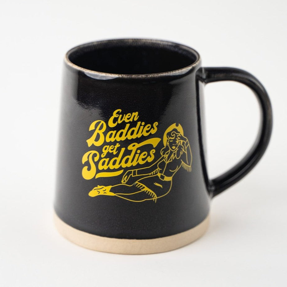 Start your day with a touch of humor! This 16oz mug features a natural clay base, a sleek black glaze, and a vibrant yellow "Even Baddies Get Saddies" imprint. Perfect for your morning coffee or tea, it’s a bold and playful reminder that even the toughest have their soft moments.