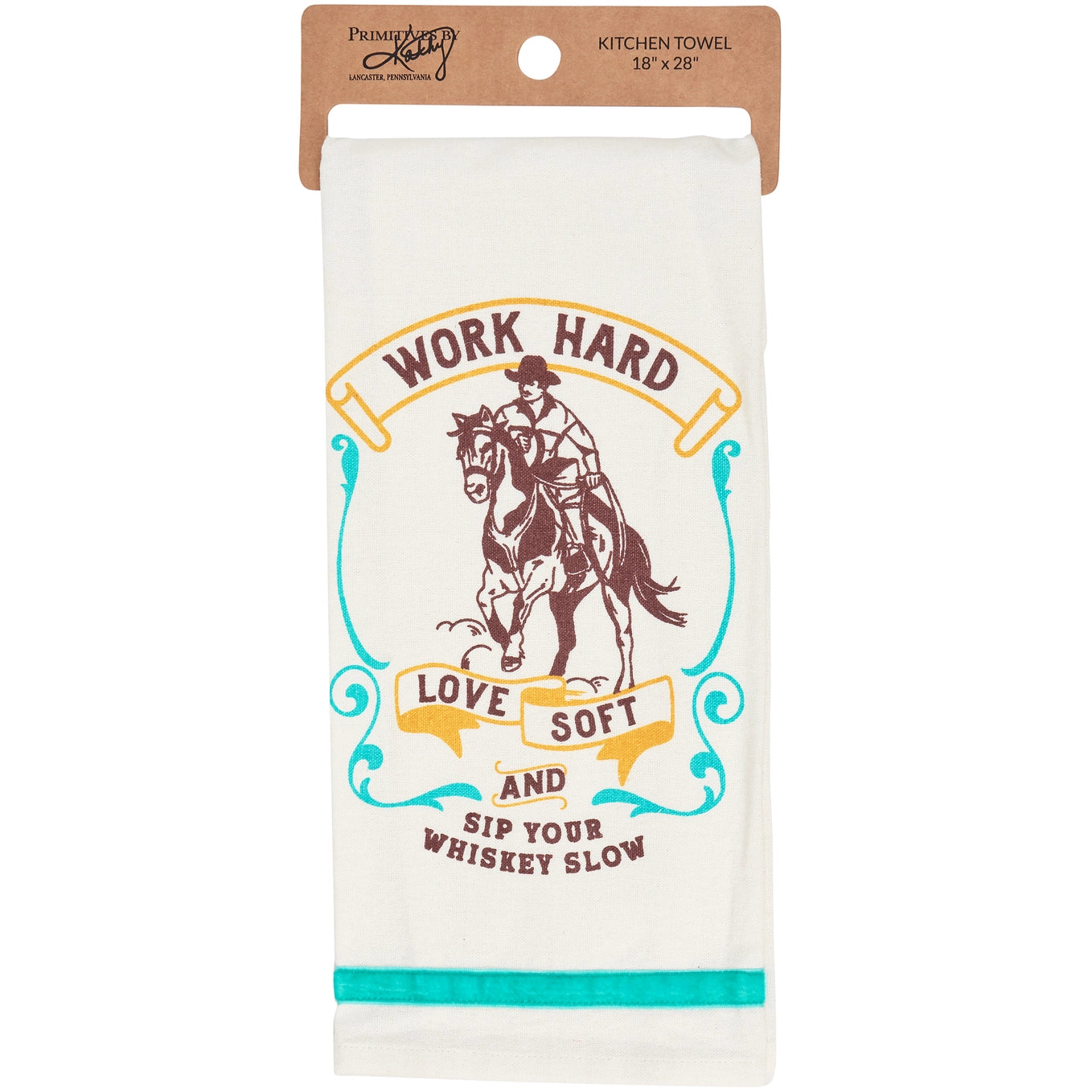 A cotton kitchen displaying a hand illustrated design of a cowboy on a horse with a western inspired sentiment that reads "Work Hard Love Soft And Sip Your Whiskey Slow." Kitchen towel features a coordinating turquoise velvet ribbon along one edge. Our Work Hard kitchen towel is conveniently machine-washable for easy cleaning.