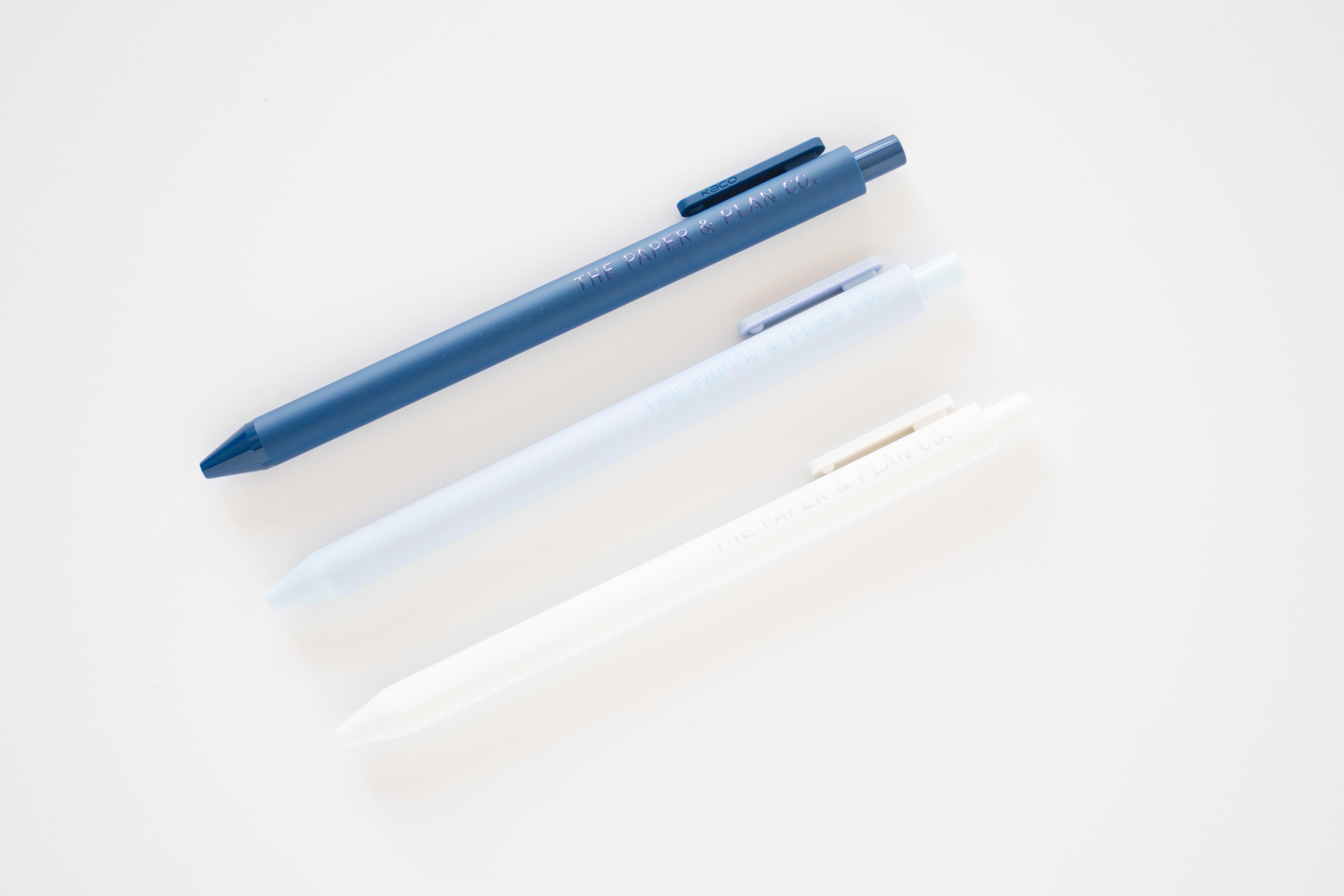 This set matches perfectly with the Chinoiserie Planner. With smooth touch barrels, these pens have a fine tip and flow beautifully with no bleeding. Pen colors are White, Navy and Powder Blue and write with black ink.